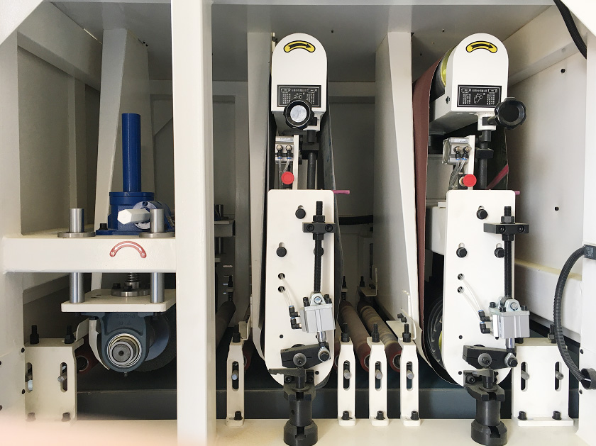 ម៉ាស៊ីនបានបំពាក់ដោយអង្គភាពខ្សែក្រវាត់ខ្សាច់ទូលំទូលាយពីរ។ ដោយប្រើប្រាស់ដោយ rollers កិន, ខ្សែក្រវាត់ខ្សាច់បង្វិលដោយល្បឿនខ្ពស់ដើម្បីដកចេញភាគខ្សែក្រវាត់, ទំហំអុកស៊ីដ, burrs ធំ, និងការខ វាក៏មានអង្គភាព roller polishing ដែលបង្វិលនៅល្បឿនខ្ពស់ និងទាក់ទងនឹងផ្ទៃដែលធ្វើការ frictionally, ផលិតផលគូរខ្សែដែលមានភ